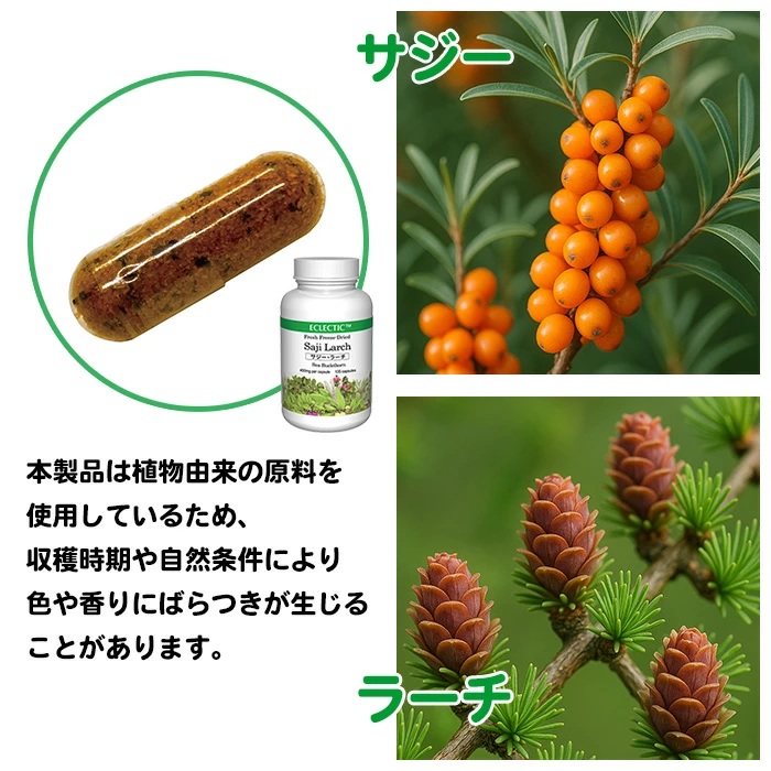 サジー・ラーチ ブレンドは、栄養価が高く、さまざまな機能性成分を含むスーパーフード「サジー」と、腸活サポート成分アラビノガラクタンを含む「ラーチ(カラマツ)」を配合したハーブサプリメントです。