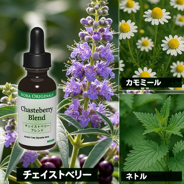 原材料:チェイストベリー果実(米国産)、カモミール花、パッションフラワー花と葉、レモンバーム葉、ネトル葉、カレンデュラ花、マリアアザミ種子/植物グリセリン