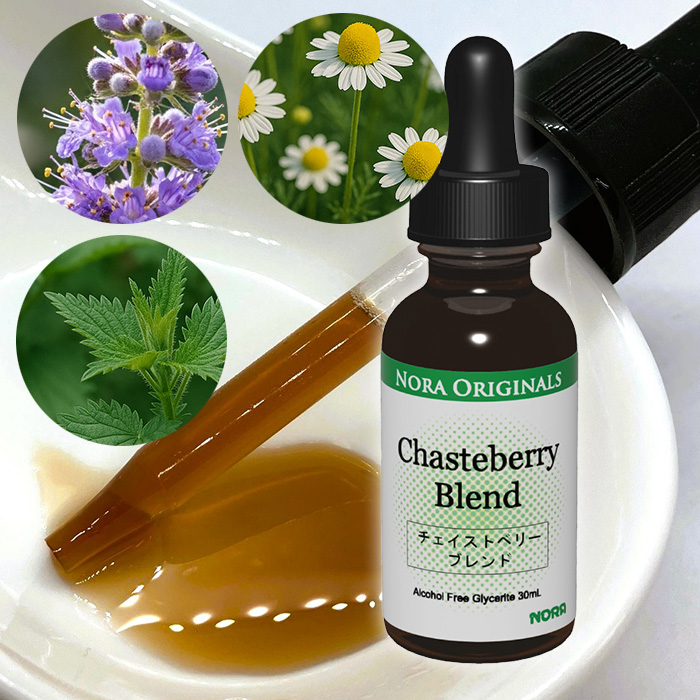 原材料:チェイストベリー果実(米国産)、カモミール花、パッションフラワー花と葉、レモンバーム葉、ネトル葉、カレンデュラ花、マリアアザミ種子/植物グリセリン