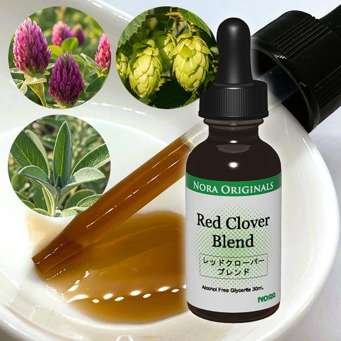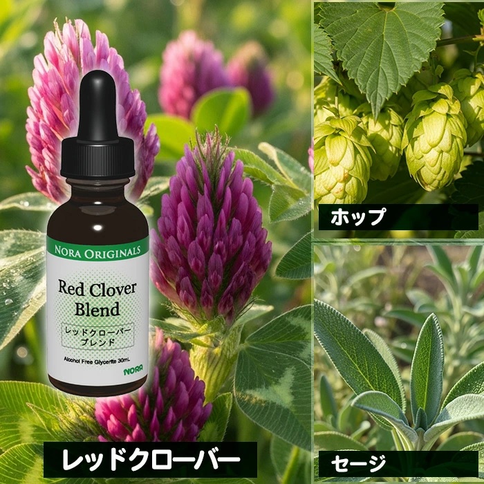 ノラ・コーポレーションがご提案する「ノラ・オリジナルズ レッドクローバーブレンド」は、ゆらぎ世代の女性に寄り添うためにブレンドされたハーブチンキです。レッドクローバーを中心に、チェイストベリー、パッションフラワー、レモンバーム、ホップ、マリアアザミ、セージなど7種類のハーブをバランスよく配合しています。