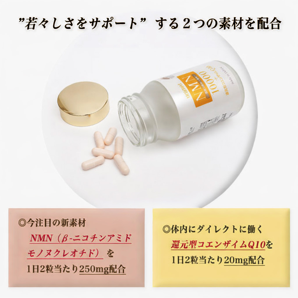 ※NMN(β- ニコチンアミドモノヌクレオチド))250mg、還元型コエンザイムQ10 20mg
